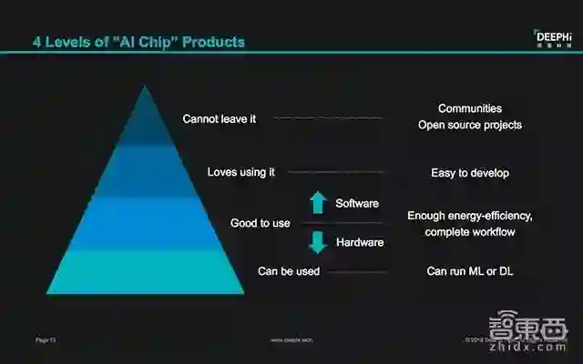 从用户对产品的体验来说,姚颂也提出分为四个层级:第一层能用,处于这一层级的AI芯片可以满足运行机器学习算法,这就表示这块芯片能用了;第二层好用,当一块AI芯片的性能功耗比已经很高,随后又有了相应的完整的软件开发工作流,能够让大家把这些软件在芯片上使用起来,这就是好用;第三层爱用,如果一款芯片的操作非常简单,可以傻瓜式的一键开发,用户就会爱用了;第四层离不开它,要相处于这一层级,芯片公司就需要为客户提供额外的价值,比如为用户提供一个平台,其上有大堆的开源项目,可供用户进行参考设计。