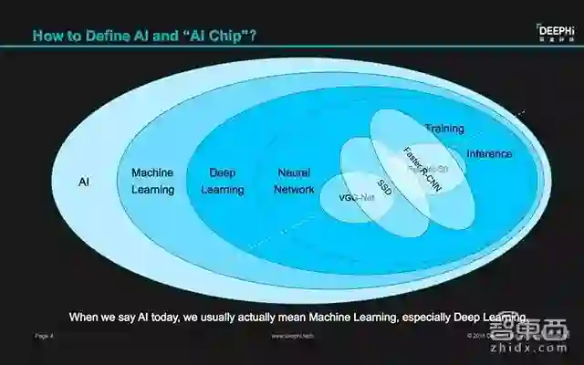 本次峰会是关于AI芯片的峰会,但是到底怎样的芯片才能称为AI芯片?一开场,姚颂先从现在大家谈论的不同的AI范围就从这一问题说起:“AI是一个相当宽泛的概念,到底该如何定义AI芯片呢?这里面隐含着一个逻辑,现在当我们说到AI的时候,其实指的只是AI中机器学习的那一部分;当我们现在说机器学习时,大部分指的又是其中深度学习的那一部分;而目前流行的神经网络算法也只是深度学习中的一部分”。