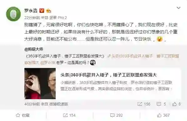 针对锤子科技与360手机谈合并的传闻,锤子科技CEO罗永浩在微博回应称,“别瞎猜”,同时他表示有几个重大好消息目前还不能公布。