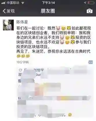 3月2日区块链知名投资人陈伟星透过朋友圈表示,今后永远不支持朱啸虎投资的任何区块链项目,也不欢迎朱啸虎参与自己投资的区块链项目。并在朋友圈称“再见了,朱迷茫,恭祝你永远生活在古典时代。”有趣的是,陈卫星并没有在朋友圈中点出朱啸虎的名字,而是用微信符号猪、笑脸、和老虎表示。