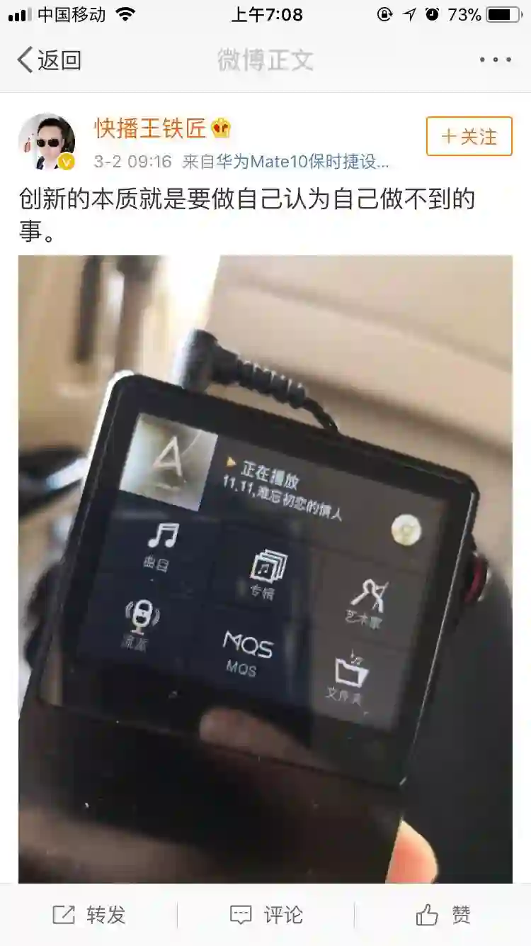 2日上午9点,王欣的个人微博帐号“快播王铁匠”发布了一条新的动态:“创新的本质就是要做自己认为自己做不到的事。”并配上了一张音乐播放器的插图,正播放着“难忘初恋的情人”。