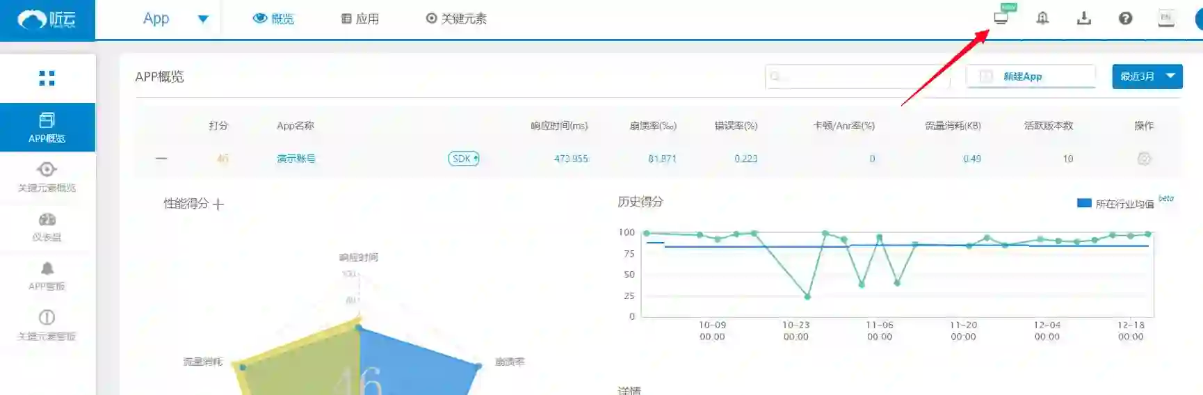 以听云App为例,进入听云控制台,点击右上角的大屏标志即可进入大屏界面
