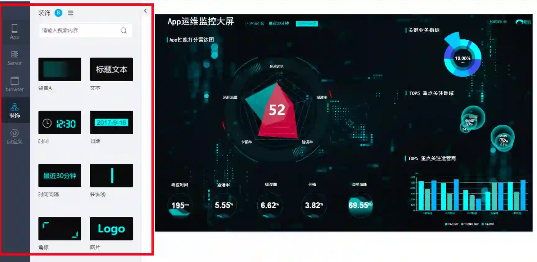 提供装饰工具美化大屏,分别有背景、文本、时间、日期、时间间隔、装饰线、角标以及图片等分类,帮助企业打造个性化的大屏展示效果