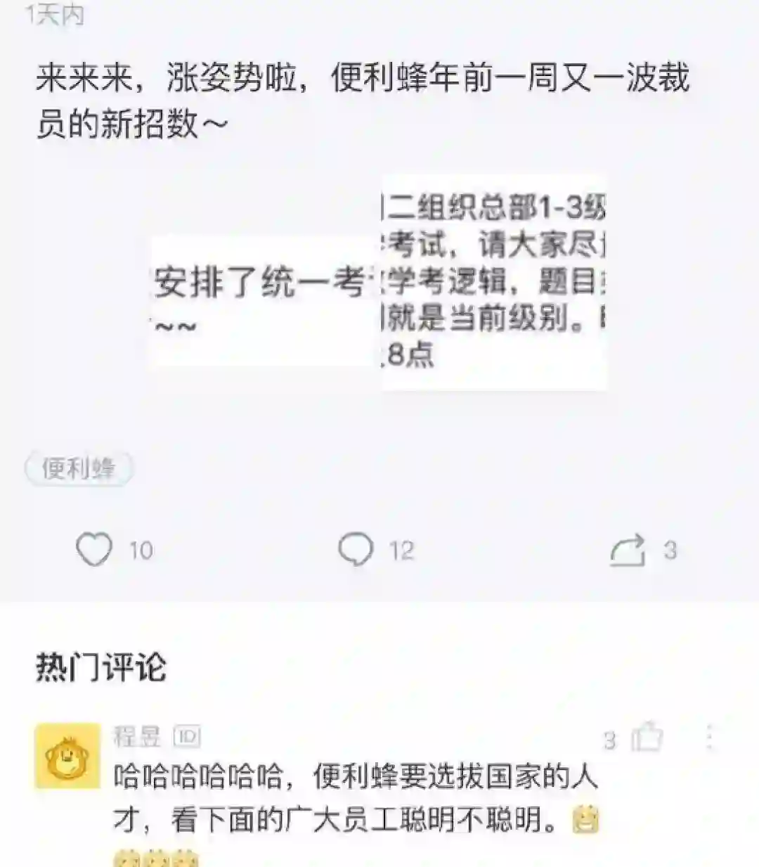 昨日消息,有便利蜂员工在脉脉爆料称,便利蜂裁员又出新招,要求 1-3 级员工参加考试,考数学、逻辑,类似行测,考试不及格的都开除。数学考试科目包括数列、三角函数、概率与统计、空间向量等。员工称:「各种强制离职手段都用上了,没收员工电脑,关在办公室不让出去,强制签字。」