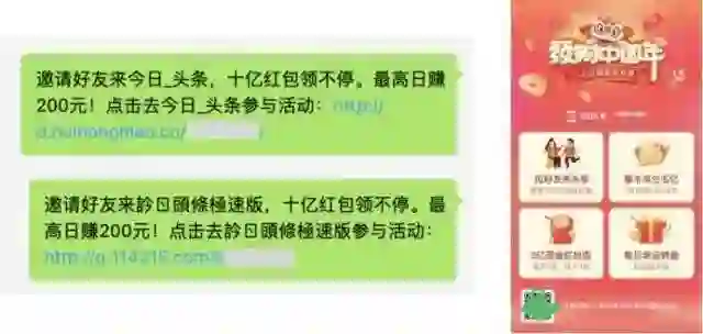 公告称,近期,一些网络平台通过现金奖励、虚拟奖品、测试等方式,诱导用户分享、传播外链内容给好友,严重影响朋友圈、群聊等功能的用户体验。头条系产品在「发财中国年」活动中,以红包形式进行诱导分享拉新,使用文字链接、图片二维码方式绕过规则。还通过变换所用域名来进行对抗,变换域名多达 72 个。经微信封禁域名后,再次使用文本口令进行对抗性传播。(来源:新京报)