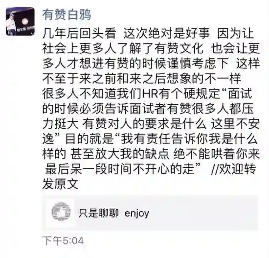 白鸦称,HR 有个硬规定,「面试的时候必须告诉面试者有赞很多人都压力挺大,有赞对人的要求是什么,这里不安逸」,目的就是「我有责任告诉你我是什么样的,甚至放大我的缺点绝不能哄着你来,最后呆一段时间不开心的走」。并附上长篇文章称,要让大家在有赞学会「enjoy」。(来源:新浪科技)