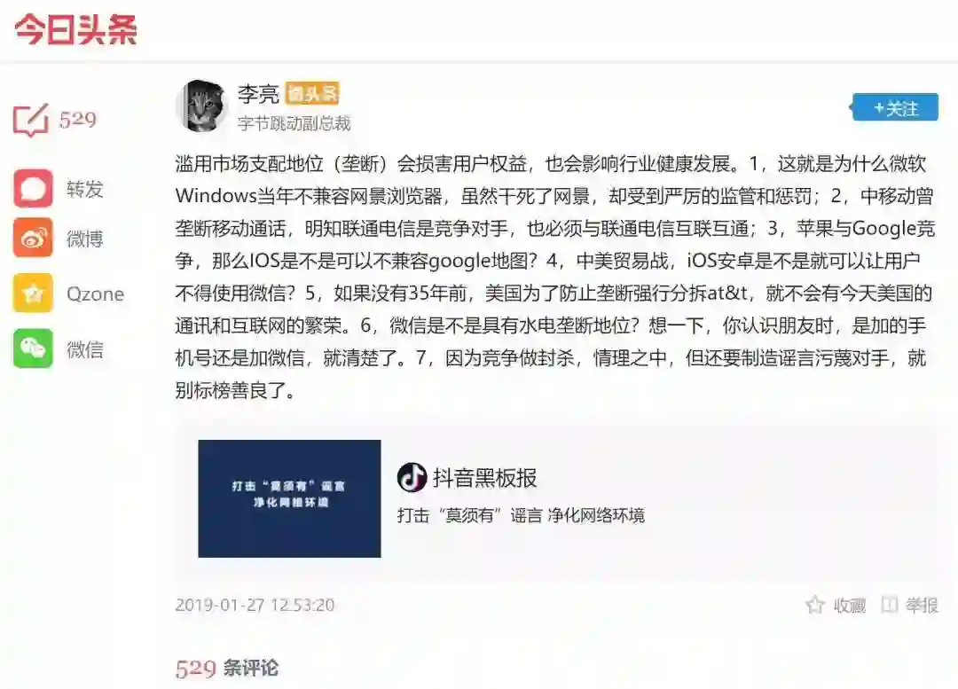 字节跳动副总裁李亮昨日午间在今日头条上发表言论称:「滥用市场支配地位(垄断)会损害用户权益,也会影响行业健康发展。」他说:「微信是不是具有水电垄断地位?想一下,你认识朋友时,是加的手机号还是微信号,就清楚了。」