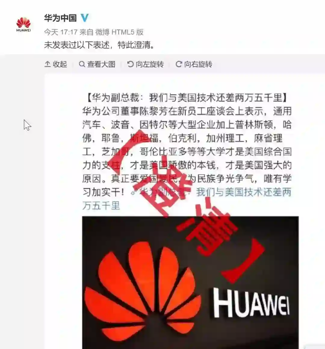 针对连日来网络上广泛传播的《华为副总裁:我们与美国技术还差两万五千里》一文,华为中国昨日晚间在官微回应称,未发表过以上表述,特此澄清。