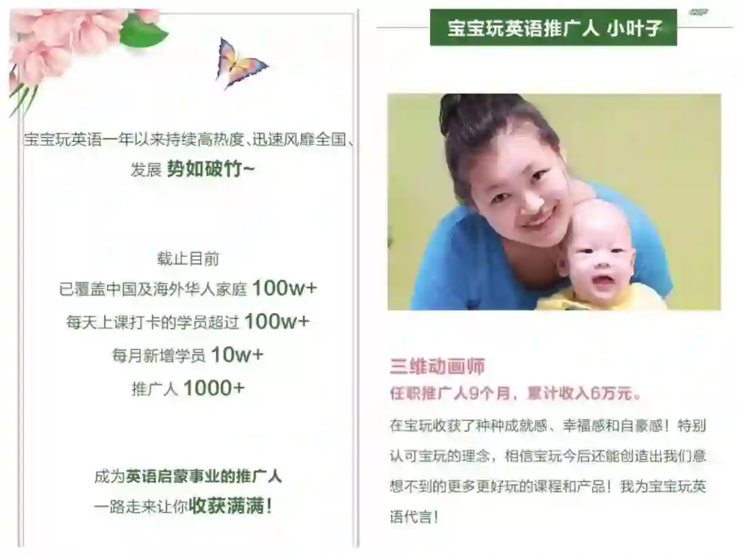 2016年6月,宝宝玩英语的产品开始收费时,就提出「推广人」的概念,让一部分有兴趣的付费用户做兼职销售。