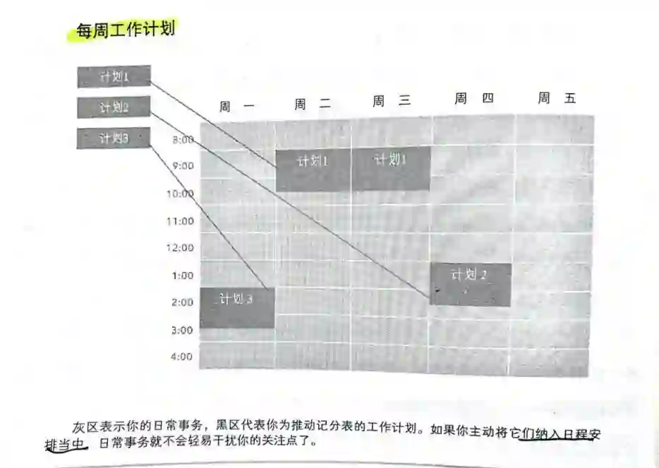 灰区表示你的日常事务,黑区代表你为推动记分表的工作计划。如果你主动将它们纳入日程安排当中,日程事务就不会轻易干扰你的关注点了。