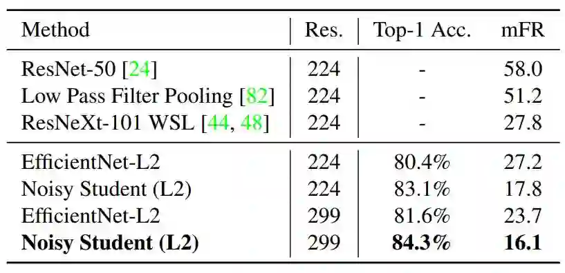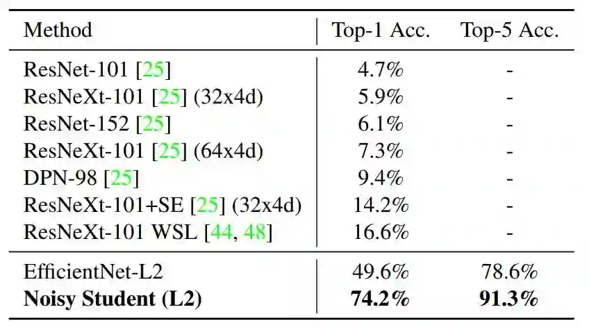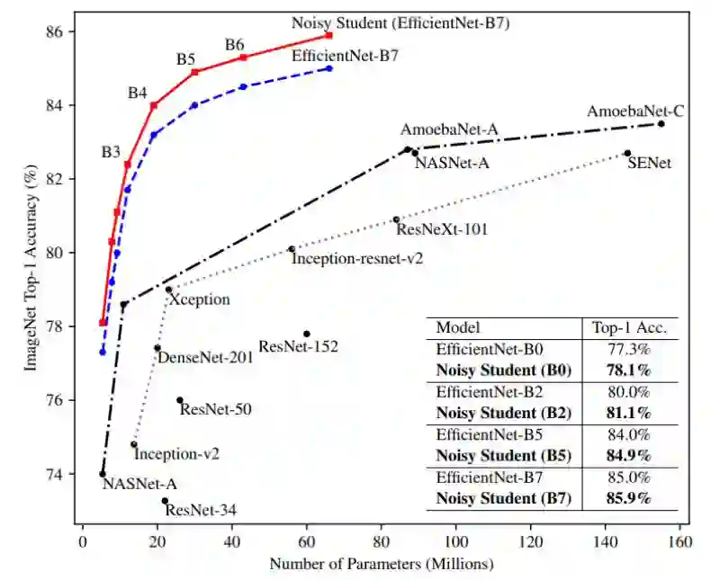 使用自训练的带噪声学生模型,加上 3 亿的无标注图像,研究者将 EfficientNet 的 ImageNet top-1 精确度提升到了新 SOTA。