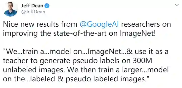 谷歌大脑负责人 Jeff Dean 和该论文的作者之一 Quoc Le 今天都在 Twitter 上介绍了这项研究工作,新方法能利用更多的未标注图像数据,并提升最终效果。