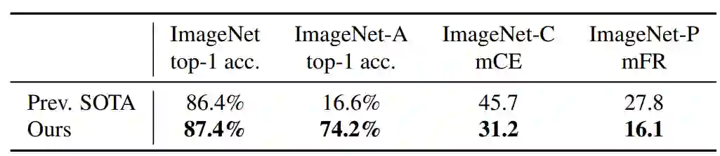 在这一部分中,研究者描述了实验的各种细节与实现的结果。他们展示了新方法在 ImageNet 上的效果,并对比了此前效果最佳的模型。此外,研究者还重点展示了新方法在鲁棒性数据集上的卓越表现,即在 ImageNet-A、C 和 P 测试集,以及在对抗样本上的鲁棒性。