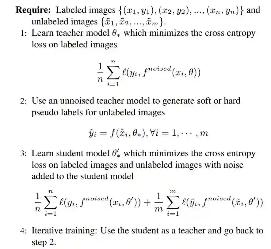 下图算法 1 给出了利用 Noisy Student 方法展开自训练的总览图,算法的输入包括标注和未标注图像。