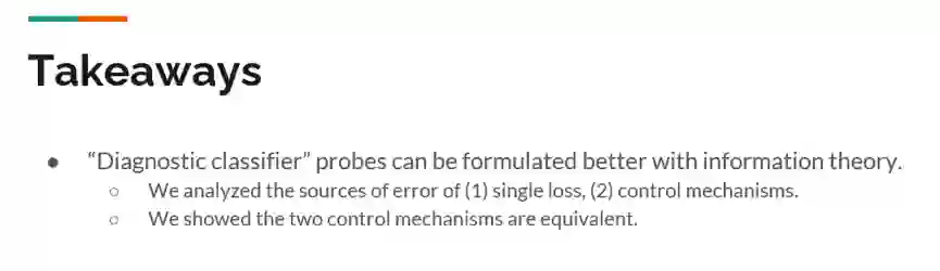 当设置好语言探针任务之后,就能够使用探针去寻找不同的语言信息,例如语法信息。Hewitt在2019年发表于NAACL的《A Structural Probe for Finding Syntax in Word Representations》中使用探针去寻找句子中的单词与单词在语法树上的距离,因此他们的输入就是句子的表征,而输出的是词与词的语法距离。他们在文章中表明,在BERT模型中,较低层的表征含有较多的语法树距离信息,但是在模型的高层中这类信息相对较少。Tenney在文章《BERT Rediscovers the Classical NLP Pipeline》中发现高层中包含的语义信息比较多,低层中语法信息比较多。这就像一个传统的Pipeline形式,可解释性强且信息局部化,其中每个流程都在完成不同的工作,且是严格按照一定顺序进行的,例如句法分析,语法分析,命名实体识别,语义角色标注,然后共指消解。其先在低层处理一些语法特征,传统的办法有手动提取特征,而在高层中通过算法提取一些语义信息,即形成低层语法,高层语义的模式。Tenney组发现BERT模型中也呈现出了类似的特征。作者在他的论文《Examining the rhetorical capacities of neural language models》对修辞特征进行了探索,他们把探针的输入设置成文章的表征,进而观察文章中有多少解释或者转折的信息,并且观察到双向的语言模型在这方面表现比单向的语言模型要好。语言探针容易设置:输入表征、让分类器预测一些诊断任务。探针结果的结果容易解读:“诊断探针任务”的效果好,则可以推测“表征的知识丰富”。但是这种传统的语言探针模式在2019年受到了挑战。2019年EMNLP获得最佳论文奖第二名的斯坦福大学的研究团队在《Designing and Interpreting Probes with Control Tasks》(作者为 John Hewitt、Percy Liang)一文种提出:当我们能够观察到好的表现的时候,不一定是因为这个表征具有很多的信息,也有可能是因为探针学会了这项任务。这是因为探针本身就是神经网络,而神经网络甚至能够从随机的向量里面学习改进(参考:2017年Zhang的《Understanding Deep Learning Requires Rethinking Generalization》)。因此只要所用的数据集够小,而探针的设置够大,探针甚至能够通过这个数据集建模。因此,他们提出使用“Selectivity”标准去选择探测器。Selectivity标准是:和使用了随机标签的控制任务相比,探针的精度提高了多少。探针本身就能够进行学习,但是在“控制任务”里面,探针也会学习。这些学到的知识会减法中被抵消。此外,Hewitt and Liang还推荐使用更简单的探针模型,因为探针的参数越少,它的学习能力就越低。针对Hewitt& Liang的文章,几个月之后,ETH Zurich的Tiago Pimentel等人在ACL 2020文章《Information-Theoretic Probing for Linguistic Structure》中反驳了他的观点。首先,他们试图从信息论的角度来定义探针任务。他们提出,语言探针的目的在于计算表征R和任务T之间有多少互信息(code-target mutual information, I(T;R))。在NLP模型中,我们通常认为词语或者句子的表示蕴含了一定的语言学性质,比如句法信息或者语义信息。为了证明这一点,人们设置了探针任务,它是关注于简单的语言学性质的分类任务。比如对于一个LSTM encoder,使用句子 embedding 来训练一个时态分类器,如果能够得到正确的分类,则认为这个 embedding 包含了一定的时态信息。Hewitt的文章认为探测任务应该使用比较简单的模型,比如使用浅层感知机。而Pimentel等人这篇文章反驳了这一观点,认为探测任务应该使用表现尽可能好的探针模型,他们反对Hewitt提出的二分法解释。Pimentel也反对使用控制任务;他们提出控制函数作为控制设置。控制函数与控制任务的区别在于控制函数将表征随机化,而控制任务将标签随机化。在后面的实验中,我们将证实这两者是等价的。此外,Pimentel还使用了信息增益这个判断标准来选择语言探针,信息增益是控制任务和探测任务交叉熵损失的差异,用此来近似信息的增量。这两篇文章形成了一种辩论,我们试图解释这两个文章里面观点不同的地方。 3