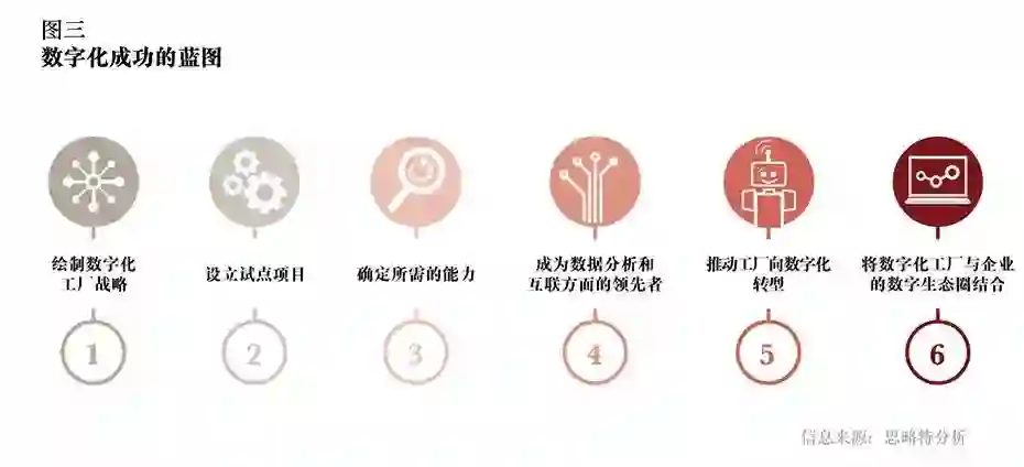 综合考虑这些因素,企业所需要的不仅仅是一套清晰的愿景,更需要一张切实可行的数字化路线图。我们制定了一套由六个环节组成的蓝图,协助企业制定或优化路线图,成功应对通向数字化工厂和工业4.0道路上的各项挑战(见图三)。