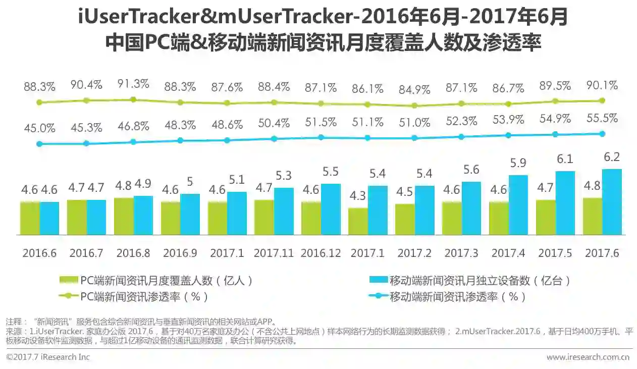 根据艾瑞网民行为监测系统iUserTracker以及移动网民行为监测系统mUserTracker的监测数据显示,2017年6月,PC端新闻资讯服务月度覆盖人数达到4.8亿,在PC网民中的渗透率同比上升1.8%至90.1%;移动端新闻资讯服务月独立设备数达到6.2亿,同比增长34.8%,在移动网民中的渗透率同比上升10.5%至55.5%。移动互联网使得获取资讯服务的门槛和成本都大大降低,也使得人们的资讯消费行为变得更频繁和更多样。虽然移动网络新闻行业渗透率仍然较低,但市场整体增速较快,发展潜能巨大。