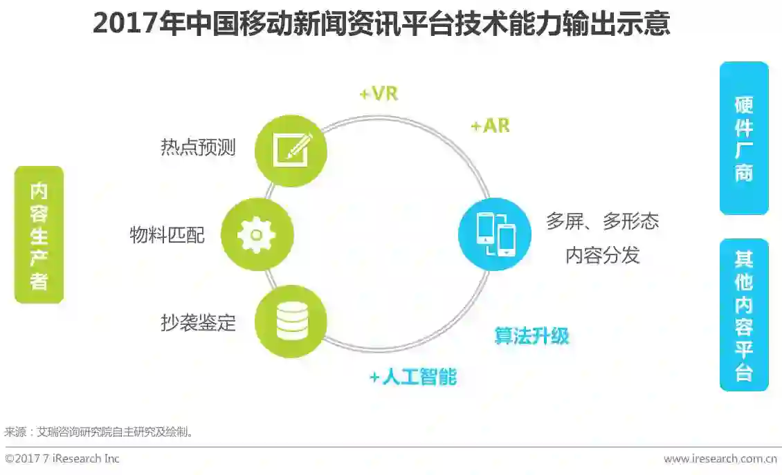 此外,为了提升产业链整体效率,平台还将向上下游所涉及的多个环节输出技术能力:1)向内容生产者开放热点预测、物料匹配等多种技术服务,助力其实现精细化内容的生产;2)向硬件厂商和短视频、音频等其他内容平台提供算法分发能力,实现资讯内容的多屏分发和多形态内容的兴趣分发。上游的精细化内容生产和下游的高效内容分发能够放大产业链协作效应,同时促进移动新闻资讯平台的快速发展。
