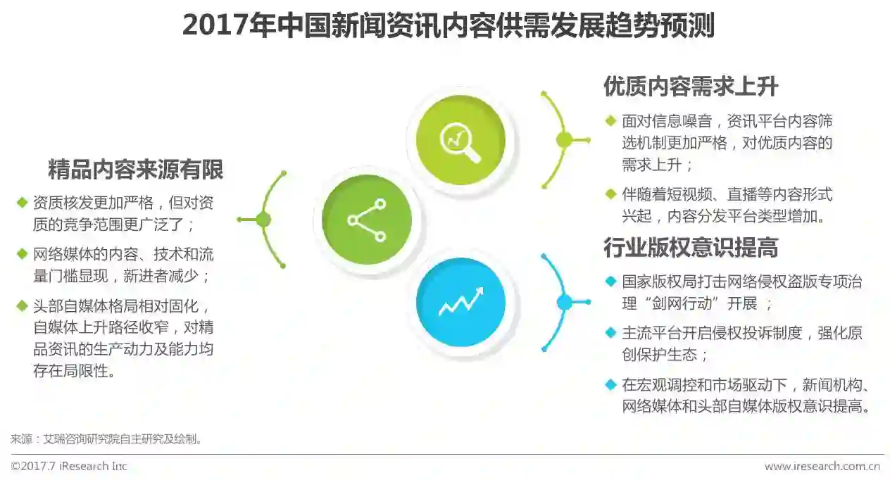 由于移动新闻资讯平台内容筛选机制趋严、内容分发平台类型增加,行业对优质内容资源的关注度进一步提升。而在内容供应侧,1)对于新闻内容提供方而言,政策收紧背景下,互联网新闻信息服务相关资质的获取更加不易,但由于通过任何渠道从事互联网新闻信息服务都必须取得相关资质,目前已有相关资质的玩家将成为各平台竞争焦点,竞争范围向直播、社交等多领域辐射;2)对于主要生产资讯内容的网络媒体和头部自媒体而言,网络媒体内容、技术和流量门槛显现、自媒体上升路径收窄,使得精品资讯的生产受到局限。