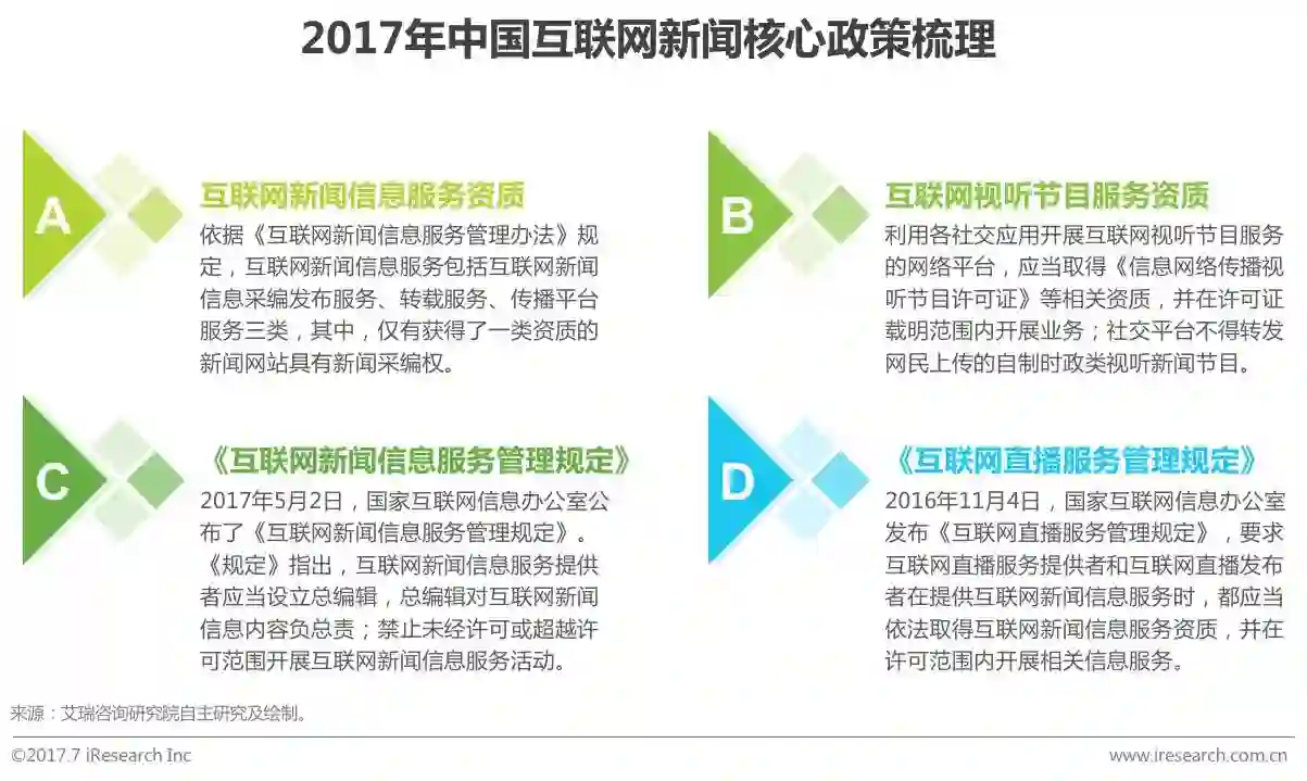 经历了二十余年的发展,互联网新闻行业逐步壮大。近年来,为了行业的健康发展,互联网新闻相关政策逐步收紧:一方面,主管部门在相关资质的核发和审查上也更加严格,截止2016年底,互联网新闻信息服务许可单位仅有294家;另一方面,对于直播等随着互联网发展而衍生出来的互联网信息服务,以及社交传播等界限相对模糊的互联网信息服务领域,规定更加具体和清晰。伴随着相关政策的进一步落实,未来互联网新闻行业的发展将更加规范。