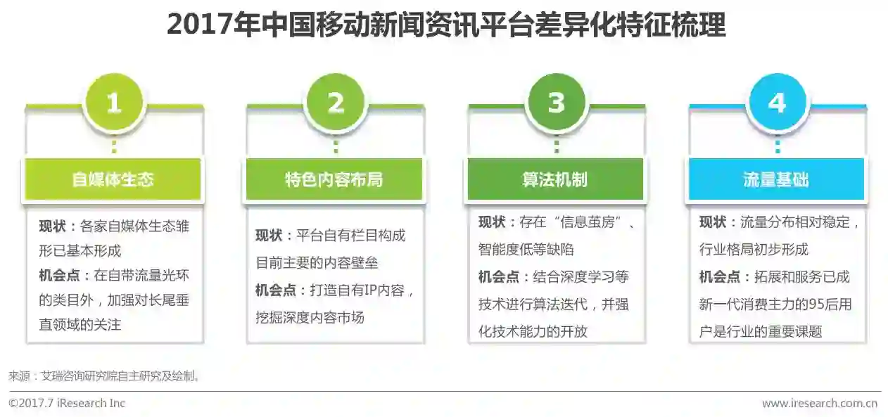 移动新闻资讯行业正在逐渐从粗放式增长回归理性,从抢占流量阶段步入培育内容阶段,未来新闻资讯行业的内容竞争和储备范围还将进一步扩大。但由于自媒体多平台注册账号、主流媒体内容多渠道分发,目前同类移动新闻资讯平台间的内容差异主要来自平台自有栏目,并不十分显著。除内容壁垒外,移动新闻资讯平台的算法机制和流量基础也是其差异化优势的主要来源,算法技术迭代与开放、拓展和服务95后用户等,均是平台未来发展的重点。
