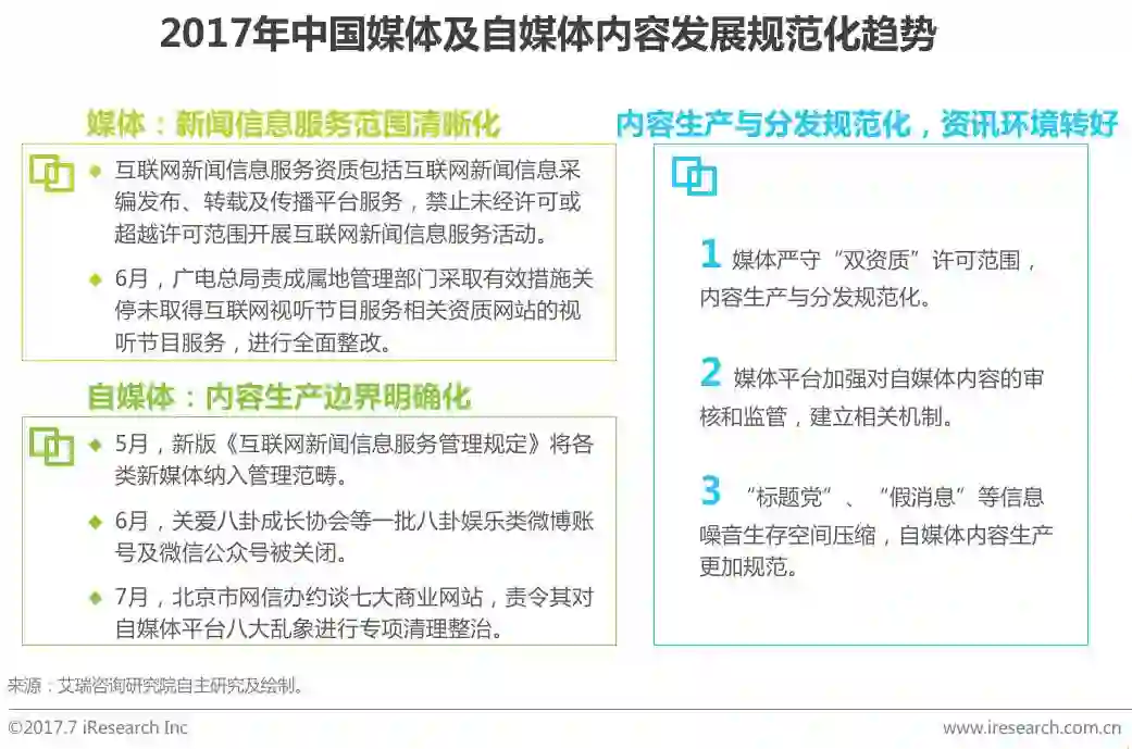 对于媒体平台而言,在互联网新闻信息服务和视听节目服务“双资质”驱动下,媒体新闻服务(包括政治、经济、军事、外交等社会公共事务的报道、评论,以及有关社会突发事件的报道、评论)的界限将更为清晰,进而指导其内容策略的制定。对于自媒体而言,其内容生产动机与用户在社交网站分享动态不同,部分自媒体出于博取眼球、刷量牟利等动机制造了大量低俗内容、虚假消息等信息噪音。未来,媒体平台将在“双资质”许可范围内,加强自媒体内容的审核和监管,并建立相关机制。而在宏观调控及平台自治下,自媒体的内容生产也将更加规范。整体资讯环境转好。
