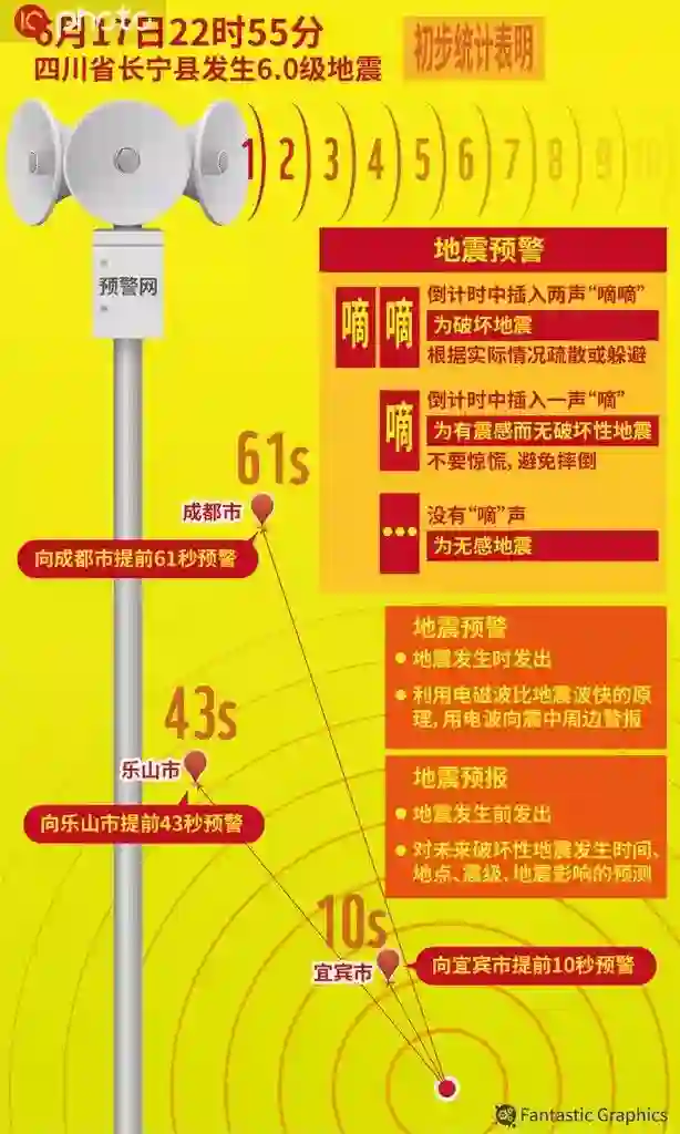 在本次宜宾地震灾害中,该系统已经向宜宾、乐山、成都等13个市州共79个区县的电视、成都的101个左右社区、宜宾乐山等地的200多个的学校发布了预警。在时间上,提前10秒向宜宾预警,提前61秒向成都预警。