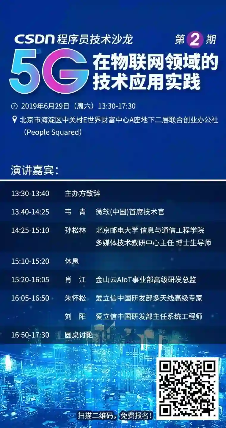 6 月 29 日,微软中国 CTO 韦青、北京邮电大学信息与通信工程学院多媒体技术教研中心主任/博士生导师孙松林、金山云 AIoT 事业部高级研发总监肖江、爱立信中国研发部多天线高级专家朱怀松、爱立信中国研发部主任系统工程师刘阳等行业内顶尖的领军者、资深的技术专家们共聚一堂,共同探讨 5G 在物联网中的巨大潜能。