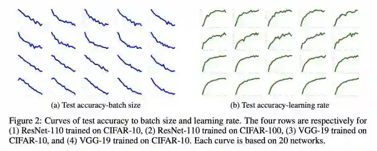 图 2:测试准确率与批处理大小、学习率的诶关系。第四行分别是(1)使用 CIFAR-10 数据集训练的 ResNet-110 模型(2)使用 CIFAR-100 数据集训练的 ResNet-110 模型(3)使用 CIFAR-10 数据集训练的 VGG-19 模型(4)使用 CIFAR-100 数据集训练的 VGG-19 模型。每条曲线都是根据 20 个网络的情况综合绘制而出。