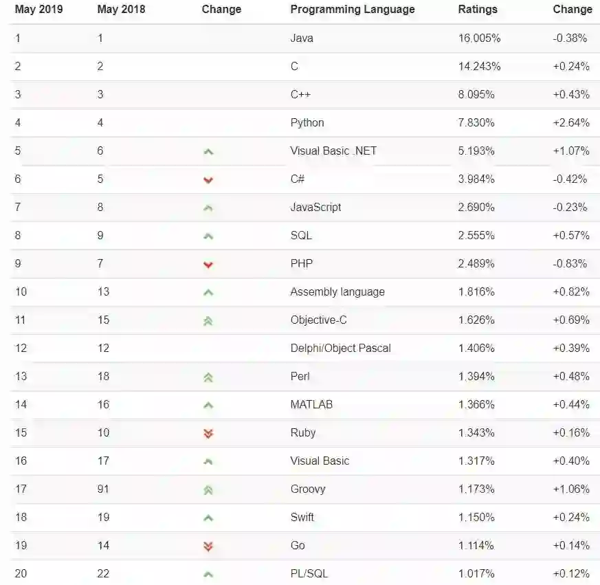 TIOBE 近日公布了2019年5月编程语言排行榜,总体排名变化不大,排名前十的依旧是:Java, C, C++, Python, Visual Basic .NET, C#, JavaScript, SQL, PHP 和汇编语言。
