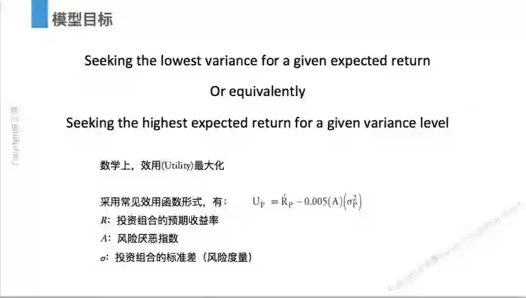 模型目标是什么呢?是给定风险的收益最大化,或者是给定收益的风险最小化,这两者其实是同一个意思。在数学上,我们追求效用的最大化,收益减去千分之五,乘以A,一般来说A为风险延误指数,再乘以投资组合的方差,这里面有两项:第一项是投资组合的收益,为鼓励项,再减去惩罚项,就得到效用。当我们把效用最大化的时候,我们就得到给定风险等级下的最优函数。因为给定风险下的效用最大化,证明了其他任何的资产配置都无法比现在这个组合性价比最优。