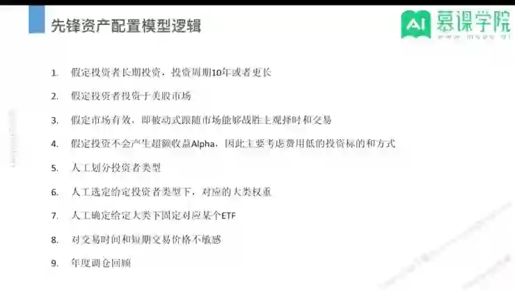 另外,他们采用了人工划分投资者的办法,并且人工选定了投资者的类型,大类资产是什么样的权重,以及通过人工确定,每一个大类下,他们认为的固定的,最优的有代表性的投资标的,也就是ETF。所以第五、第六、第七和第九点,考虑到频率较低(具有可操作性),他们每年都会去做。