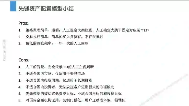 以上就是先锋的资产配置模型,所有工作都是纯人工去做的,这和国内某知名智能投顾提供商一样。这并不是我们真正想要的智能投顾。它的好处是什么呢?策略原理简单、透明,人工确定了所有的东西,所以你选的人非常厉害,是巴菲特之流,那么你的收益就会很高。交易执行也非常简单,一年一次,不存在调仓的考虑,所需的成本非常低,需要做的工作非常少。