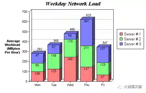 堆积柱状图,适合可视化含有子分类的分类数据。下面这张图是用堆积柱状图展示的日常服务器负载情况统计。使用不同颜色进行堆叠,对不同服务器之间进行比较,从而能查看并了解每天中哪台服务器的工作效率最高,负载具体为多少。代码与柱状图样式相同,同样为循环遍历每个组,只是这次是在旧柱体基础上堆叠,而不是在其旁边绘制新柱体。