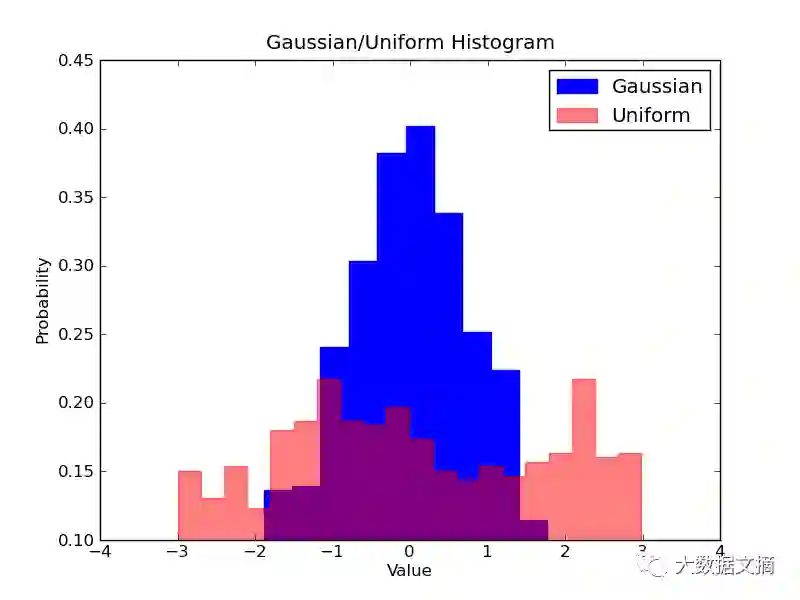 如果要比较数据中两个变量的分布情况该怎么办呢?有些人可能会认为,必须要制作两个独立的直方图将它们并排放在一起进行比较。但实际上,有更好的方法:用不同透明度实现直方图的叠加。比如下图,将均匀分布透明度设置为0.5,以便看清后面的正态分布。这样,用户就可以在同一张图上查看两个变量的分布了。