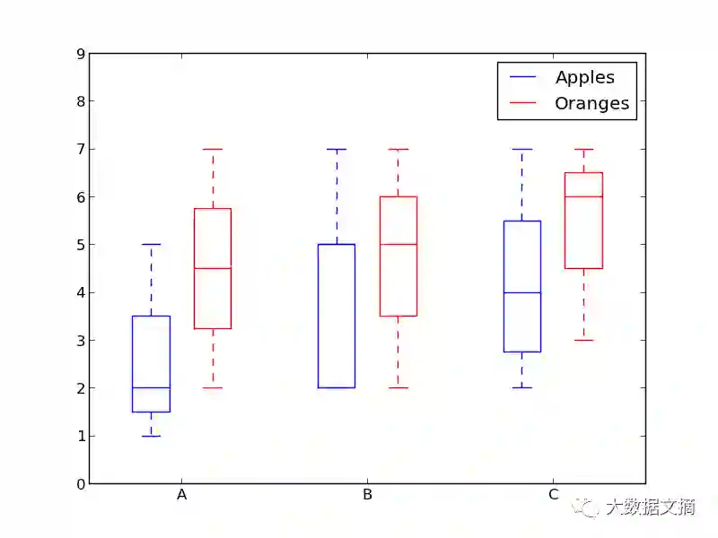 由于箱形图是为每个组或变量绘制的,因此设置起来非常容易。x_data是组或变量的列表,x_data中的每个值对应于y_data中的一列值(一个列向量)。用Matplotlib库的函数boxplot()为y_data的每列值(每个列向量)生成一个箱形,然后设定箱线图中的各个参数就可以了。