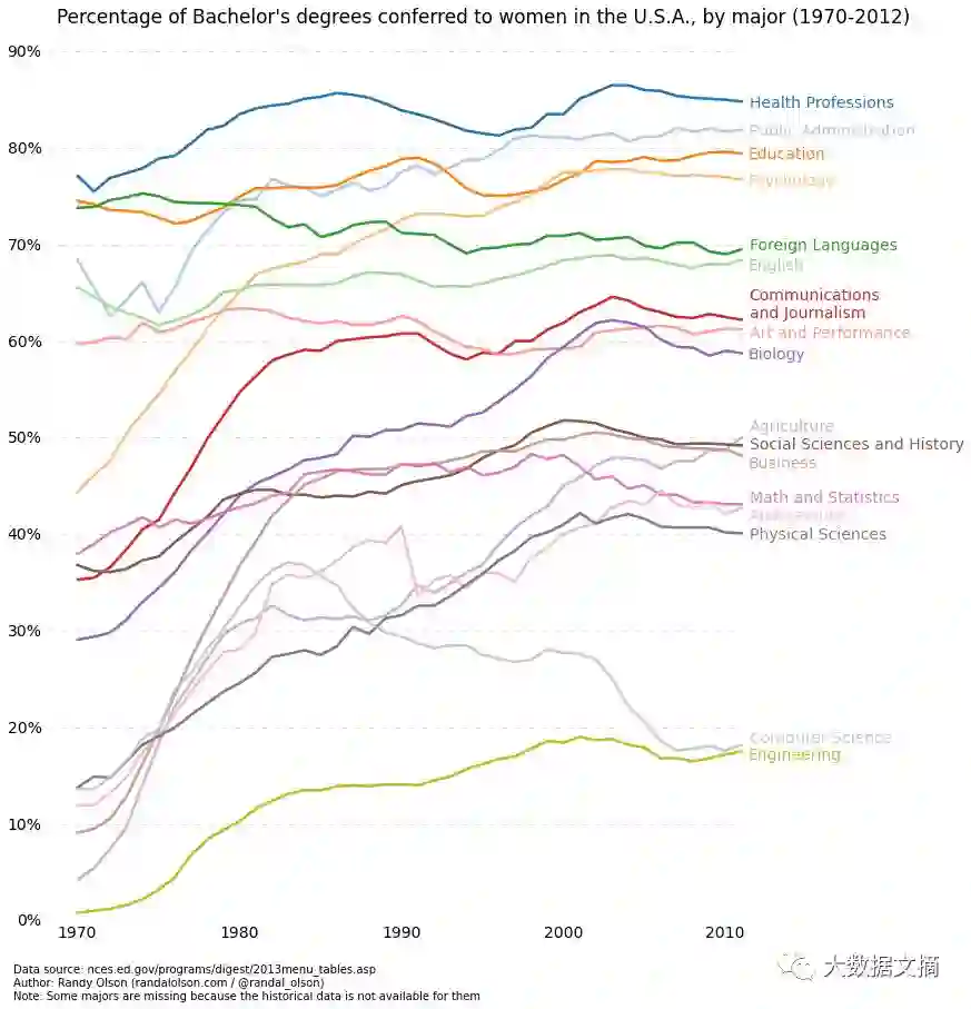 如果一个变量随着另一个变量的变化而大幅度变化(具有很高的协方差),为了清楚地看出变量间的关系,最好使用折线图。例如,根据下图,我们能清楚地看出,不同专业获得学士学位的人群中,女性所占的百分比随时间变化产生很大变化。