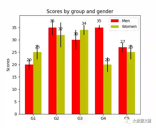 分组柱状图,如下图所示。它允许对多个分类变量进行对比。如图所示,两组关系其一是分数与组(组G1,G2,...等)的关系,其二是用颜色区分的性别之间的关系。代码中,y_data_list是一个列表,其中又包含多个子列表,每个子列表代表一个组。对每个列表赋予x坐标,循环遍历其中的每个子列表,设置成不同颜色,绘制出分组柱状图。