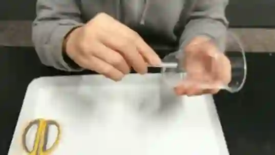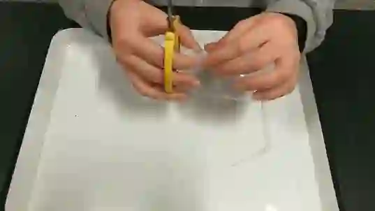 用剪刀在塑料杯上剪下一个小洞