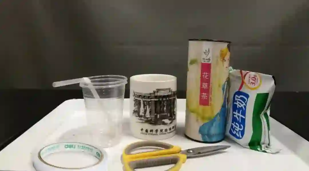 所标杯、剪刀、双面胶、塑料杯、吸管、牛奶、各种花草茶