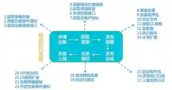在团队内部有织云自动化部署平台,从申请设备获取资源、发布部署、检测,进行测试,上线。在每个环节还有些细节步骤,如申请设备的时屏蔽告警事件,如发布时同步传输文件、如发布后检测程序的包进程是否启动,启动之后进行业务测试。