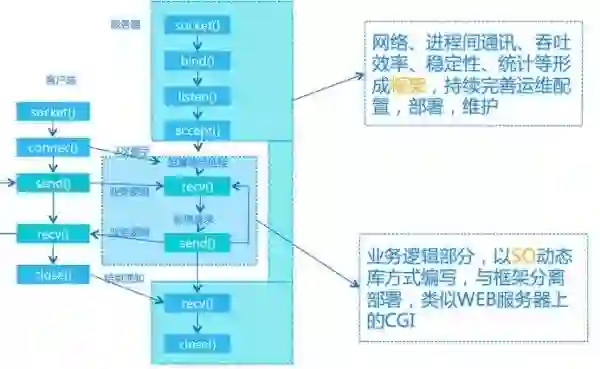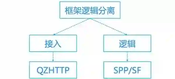业务逻辑部分用 SO 动态库方式编写与框架分离部署,类似 Web 服务器上的CGI。接入层用 QZHTTP,逻辑层是 SPP 和 SF 的框架。