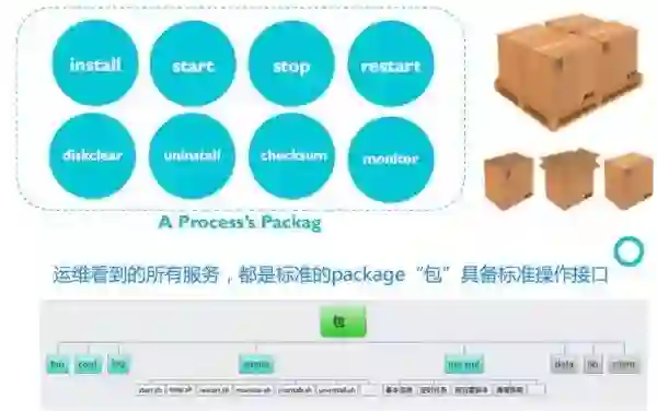 把它全部放在一个类似于包里面,装进一个盒子里。之后提供标准的操作接口,如安装、卸载、启动、停止操作等这些操作让它们变成有关联的。