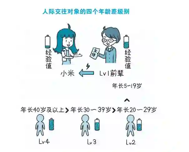 简单地以我们与人际交往对象的年龄差来划分一个级别,大致可分为四级:
