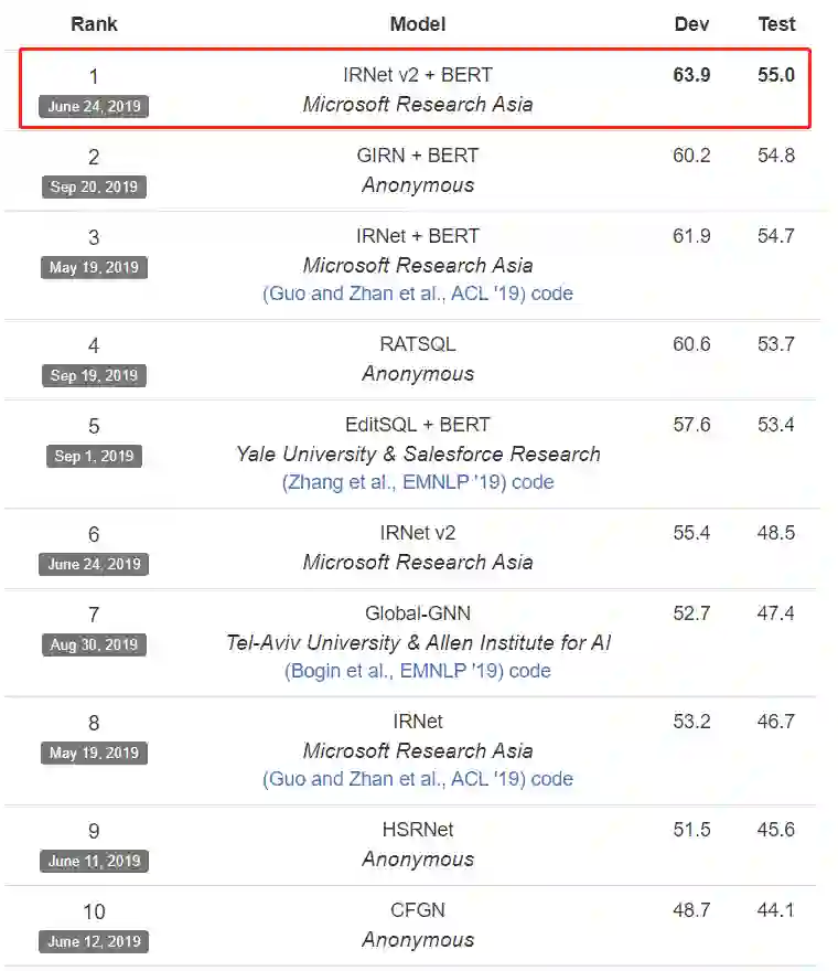 图2:微软亚洲研究院提出的算法目前在耶鲁语义分析与 Text-to-SQL 挑战赛中位列第一