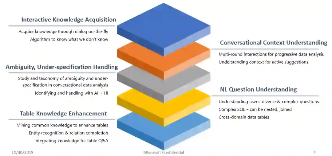 区别于普通的问答系统,对话式数据分析是一个典型的交叉领域,综合了自然语言理解、多维数据(multi-dimensional data)分析、机器学习、知识工程、人机交互等多个领域。建立一个端到端的对话式数据分析系统主要需要研究以下问题: