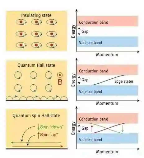 重要的概念重复一遍:对真空或一般绝缘体,TKNN拓扑不变量为零。量子霍尔体系TKNN拓扑不变量不为零,其与真空之间存在一个导电表面态,即边缘态,表现出量子霍尔电导,如图1中间图所示。这一边缘态将量子霍尔效应与拓扑完整联系起来,解惑了外行感到很奇怪的问题:量子霍尔效应为何会与千里之外的拓扑有联系?