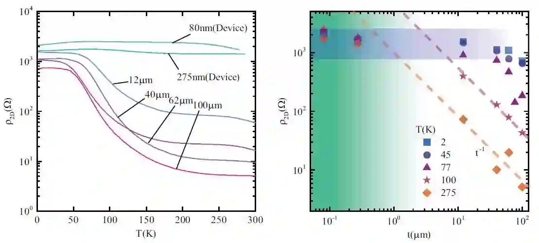 图4. BiSbTeSe2单晶的变温二维电阻率(左)和不同温度二维电阻率与样品厚度的关系(右)。