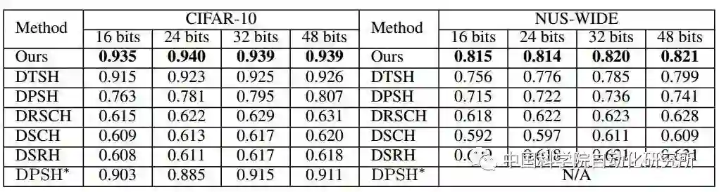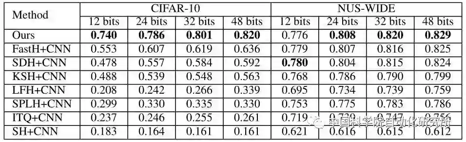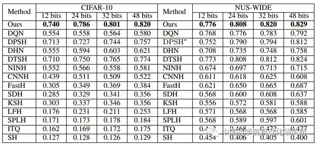 表1:第一组实验设置下不同方法的 MAP。 NUS-WIDE 数据集的 MAP 是根据返回的前 5,000 位邻近值计算的。DPSH * 表示重新运行 DPSH 作者提供的代码。