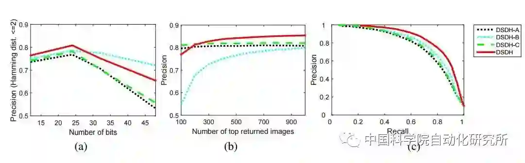 图2:DSDH-A、DSDH-B、DSDH-C 和 DSDH 在 CIFAR-10上得到的结果:「a」Hamming 半径为 2 的精度曲线; 「b」不同数目最佳返回图像的精度曲线(不确定); 「c」具有 48 位哈希编码的精度-召回曲线。
